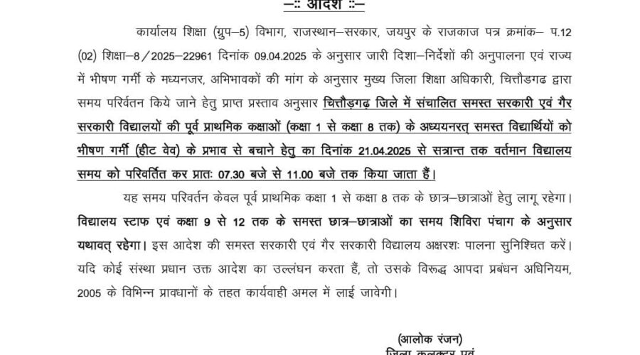 चित्तौड़गढ़ । राज्य में भीषण गर्मी के मध्य नजर, अभिभावकों की मांग एवं मुख्य जिला शिक्षा अधिकारी के समय परिवर्तन के प्रस्ताव के अनुसार पूर्व प्राथमिक कक्षा 1 से 8 तक में अध्यनरत छात्र-छात्राओं के लिए कक्षा संचालन प्रातः 7:30 बजे से प्रातः 11 बजे तक किया गया है । जिला कलक्टर आलोक रंजन ने … Continue reading भीषण गर्मी को देखते हुए प्राथमिक विद्यालय संचालन समय परिवर्तित