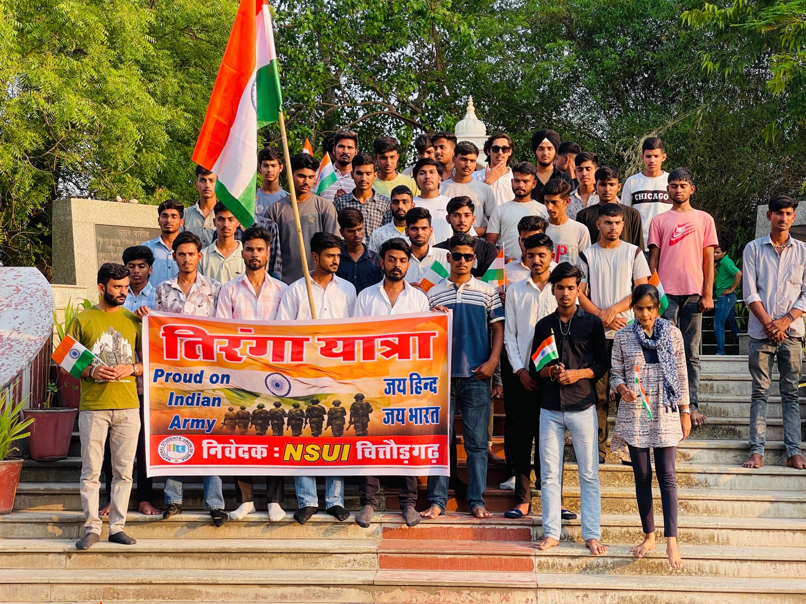 चित्तौड़गढ़। एनएसयूआई द्वारा राष्ट्रीय अध्यक्ष वरुण चैधरी व प्रदेश नेतृत्व एनएसयूआई प्रदेश अध्यक्ष विनोद जाखड़ के निर्देशानुसार संजय राव के नेतृत्व में देश के जवानों के लिए एक तिरंगा यात्रा का आयोजन किया गया। पहलगाम पर हुए आतंकी हमले में जवाबी कार्यवाही कर रही हमारी देश की सेना का हौसला अफजाई के लिए एनएसयूआई ने तिरंगा रैली निकाली। रैली में संजय सेन, मनीष सुथार, अनीष अठवाल, राजा शेख, गौरव खटीक, बालकिशन, विशाल शर्मा, राधेश्याम जाट, सुशील व्यास, सुरेंद्र सिंह, कैलाश डांगी, सुरेश मीणा, देवेंद्र, रोहितजाट, कैलाश शर्मा, सुरेश धाकड़, सागर खटीक, हेमंत जोशी आदि सभी कार्यकर्ता मौजूद थे।