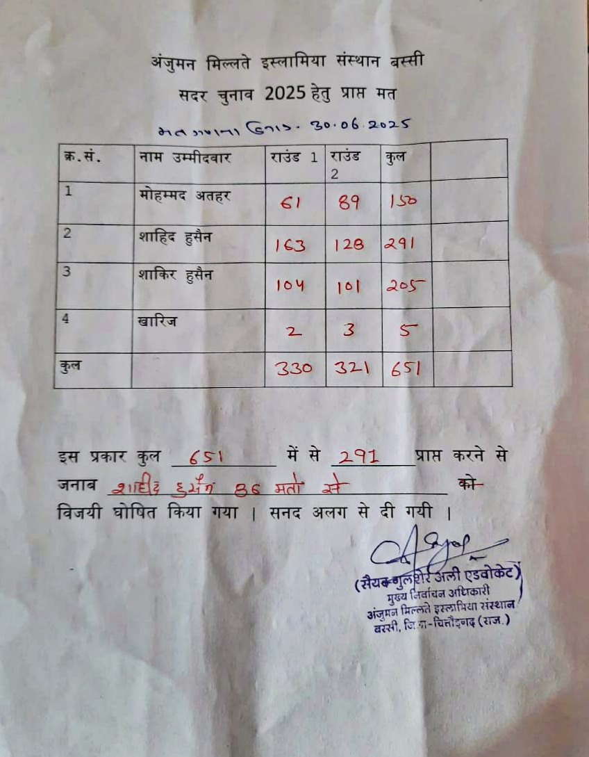 बस्सी (चित्तौड़गढ़)। कस्बे के सामाजिक और धार्मिक संगठन अंजुमन मिल्लत-ए-इस्लामिया संस्था बस्सी के सदर पद हेतु रविवार को हुए चुनाव शांतिपूर्वक एवं उत्साहपूर्ण वातावरण में सम्पन्न हुए। ग्रामीणों में इस चुनाव को लेकर खासा जोश और भागीदारी देखने को मिली।