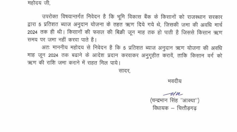 The time period of 5 percent interest subsidy loan scheme should be extended. MLA Aakya wrote a letter to the Chief Minister demanding चित्तौड़गढ़। विधायक चंद्रभानसिंह आक्या ने मुख्यमंत्री भजनलाल शर्मा को पत्र लिखकर 5 प्रतिशत ब्याज अनुदान ऋण योजना की समयावधि बढ़ाने की मांग की है। विधायक आक्या ने मुख्यमंत्री भजनलाल शर्मा को लिखे … Continue reading 5 प्रतिशत ब्याज अनुदान ऋण योजना की समयावधि बढ़ाने की मांग